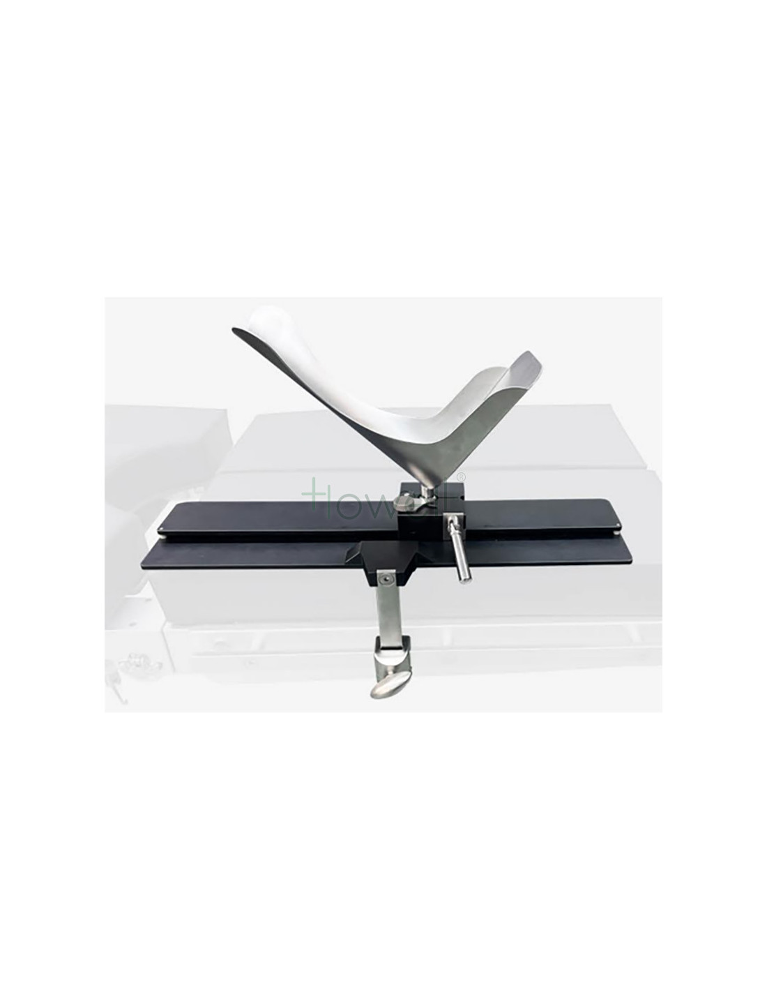 The product is fixed with spherical support and has a displacement track below, which can easily and accurately realize the extension and flexion of the patient's affected limb during total knee replacement surgery, tilt and rotation; multiple locking devices, the doctor is more convenient to operate; the modular single rod connection allows the knee joint positioner to be easily installed in the sterile field, which simplifies the isolation of the sterile field in total knee replacement surgery process.