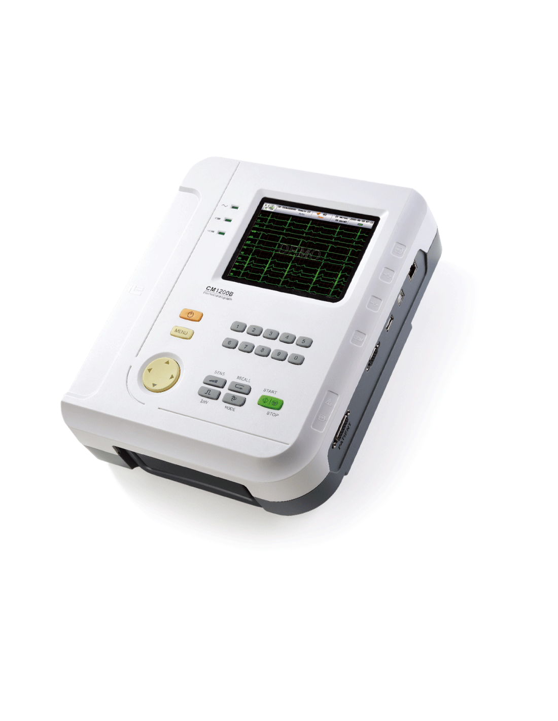 Serce CM1200B stanowi cyfrowy system rejestracji 12‑kanałowego EKG z funkcją automatycznego pomiaru i interpretacji oraz wyświetlaczem o przekątnej 5,7 cala (TFT/LCD) zapewniającym wyraźny podgląd stanu wyprowadzeń i przebiegów. Wyświetlacz umożliwia szybką ocenę jakości sygnału — informacja o stanie elektrod (lead status) redukuje czas przygotowania badania i zmniejsza ryzyko artefaktów przed wydrukiem lub zapisem elektronicznym.