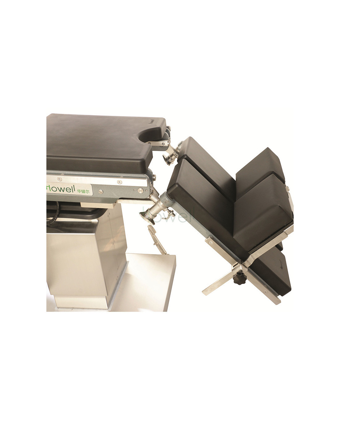 Howell HE-GB to płyta podpórki stóp (foot support plate) przeznaczona do montażu na burtowych szynach stołu operacyjnego. Produkt zaprojektowano jako lewą/prawą podpórkę („Foot Rest Left/Right”), umożliwiającą stabilne podparcie stóp i kolan pacjenta na obniżonej sekcji nóg stołu, co jest szczególnie przydatne podczas zabiegów kręgosłupa i proktoskopii oraz w pozycjach z zastosowaniem odwróconego Trendelenburga. Konstrukcja ze stali nierdzewnej i modułowy sposób mocowania zapewniają zgodność z wieloma układami sekcji nóg stołu oraz prostą regulację położenia.