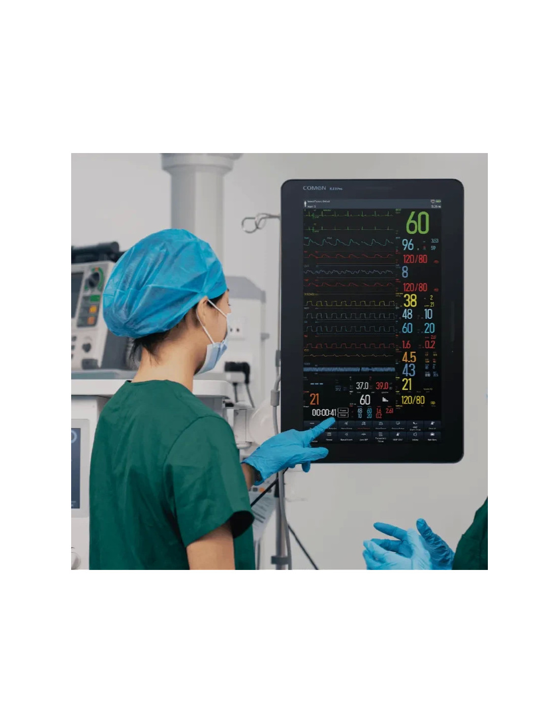 For clinicians, viewing more vital signs from the monitor is significant. Especially, when the patient is under severe condition, a great monitor able to provide more insights can help the clinicians to make informed decisions. Thus, Comen develops K22Pro to fulfil the needs of a ‘bigger’ vision. For its screen size. It provides a 21.5-inch capacitive screen. In the meantime, the monitor can rotate to either landscape or portrait mode. Regarding the landscape, it enables clinicians to view longer chosen waveform on the monitor and observe their variance in detail. In comparison, portrait mode is aimed to display more waveform channels, under this mode, clinicians can select more vital signs to display on the screen simultaneously. It is sui...