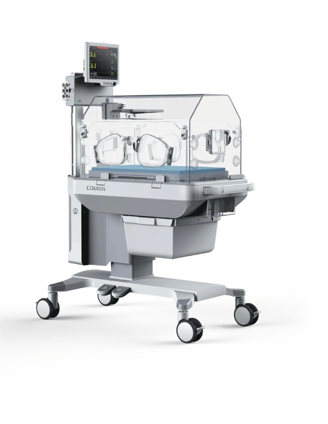 Comen B8 to zaawansowany inkubator noworodkowy klasy premium przeznaczony dla oddziałów intensywnej opieki noworodkowej (OION) oraz oddziałów położniczych i neonatologicznych. Model B8 łączy funkcję środowiska terapeutycznego z wbudowanym systemem monitorowania noworodka, co skraca czas dostępu do krytycznych danych i zmniejsza liczbę urządzeń przy łóżku pacjenta. Projekt skupia się na stabilności parametrów mikroklimatu, kontroli tlenu, bezpieczeństwie termicznym i ergonomii obsługi, aby wspierać opiekę nad skrajnymi wcześniakami i dziećmi wymagającymi intensywnej terapii.